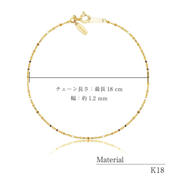 プレート部分には、「K18」の刻印が有り、素材と品質の良さも証明。オフィスシーン、フォーマルシーンに合わせやすい、使い勝手のよいブレスレットです。チェーンブレスレットはスライドアジャスターになっているので、最大18cmまで自由な長さで調節可能。お好みの長さに調整してお楽しみください。