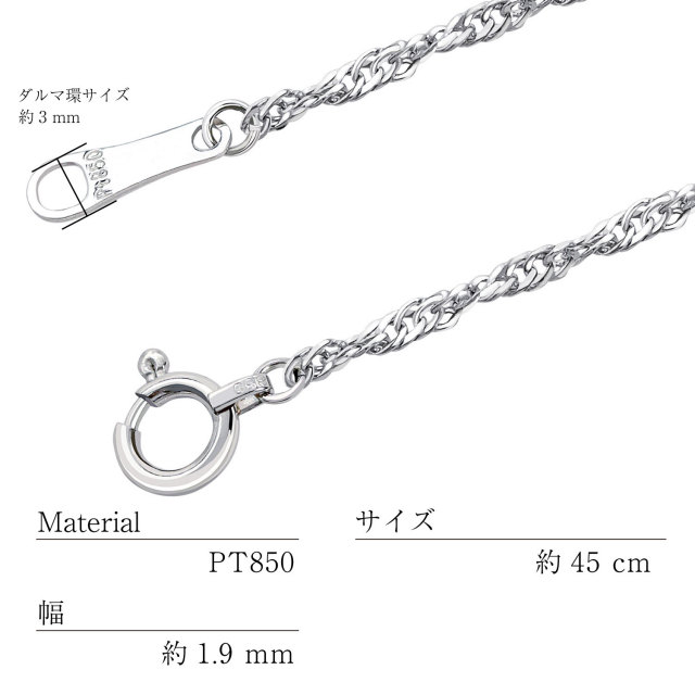 プレート部分には、「pt850」の刻印が有り、素材と品質の良さも証明。オフィスシーン、フォーマルシーンに合わせやすい、使い勝手のよいチェーンです。