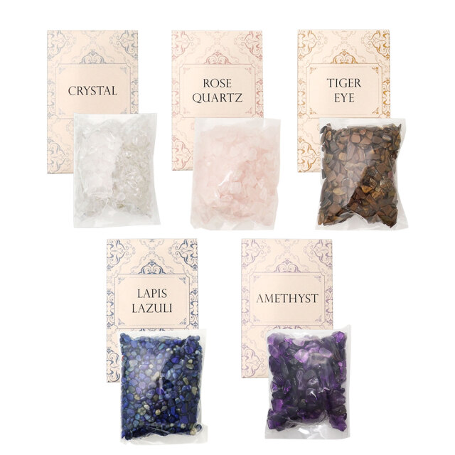 ■ 内容量:各約50g×5種 【水晶、ローズクォーツ、ラピスラズリ(ミックス)、アメジスト、タイガーアイ】※本製品は香料を含んでおりません。