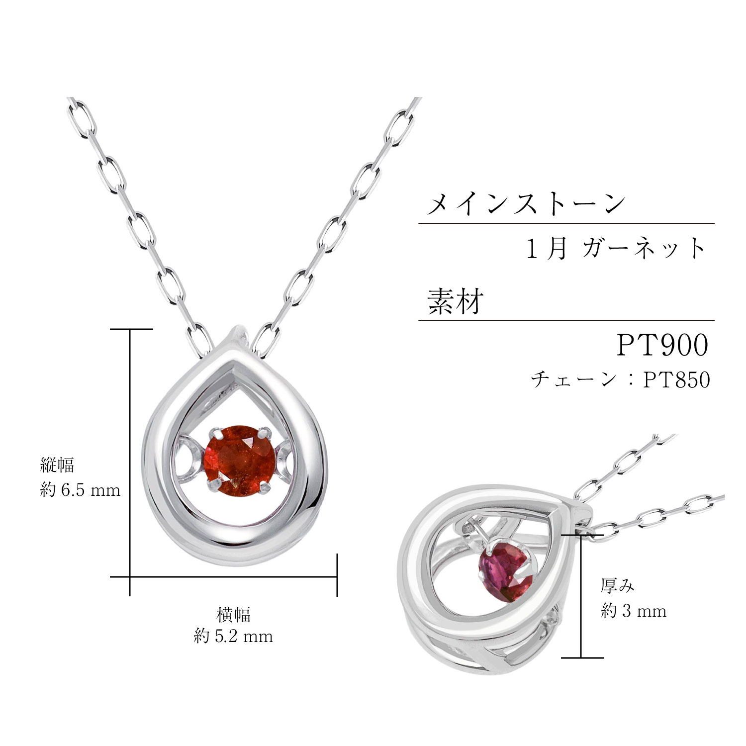 シンプルなドロップデザインネックレスに、選べる12誕生石をあしらった遊び心のあるデザインネックレス。 誕生石は身に着けるとお守りになるとも信じられています。 ファッションアイテムとして、お守りジュエリーとして、そして相手のためだけに選ぶギフトとしてもオススメです。 胸元で振動するように揺れて動く、ダンシングストーン。 石だけが躍る(Dance)ように振動することが特徴。左右の丸カンで結ばれて、前後に細かく揺れて輝きます。 クロスフォー社が開発したこの特殊な技術は数々のメディアで取り上げられ、日本特許を取得し国際特許も申請中。 ダンシングストーンだけの魅力で、世界中の女性のハートを虜にします。 素材:PT900/チェーンPt850 チェーン:あずき 約40cm(Pt850 ) サイズ:約 縦6.5x横5.2mm 石:ダンシングストーン 12誕生石 約0.02ct/ガーネット 付属:ブランド純正ボックス/紙袋/品質証明書 製造国 日本(Made in Japan)