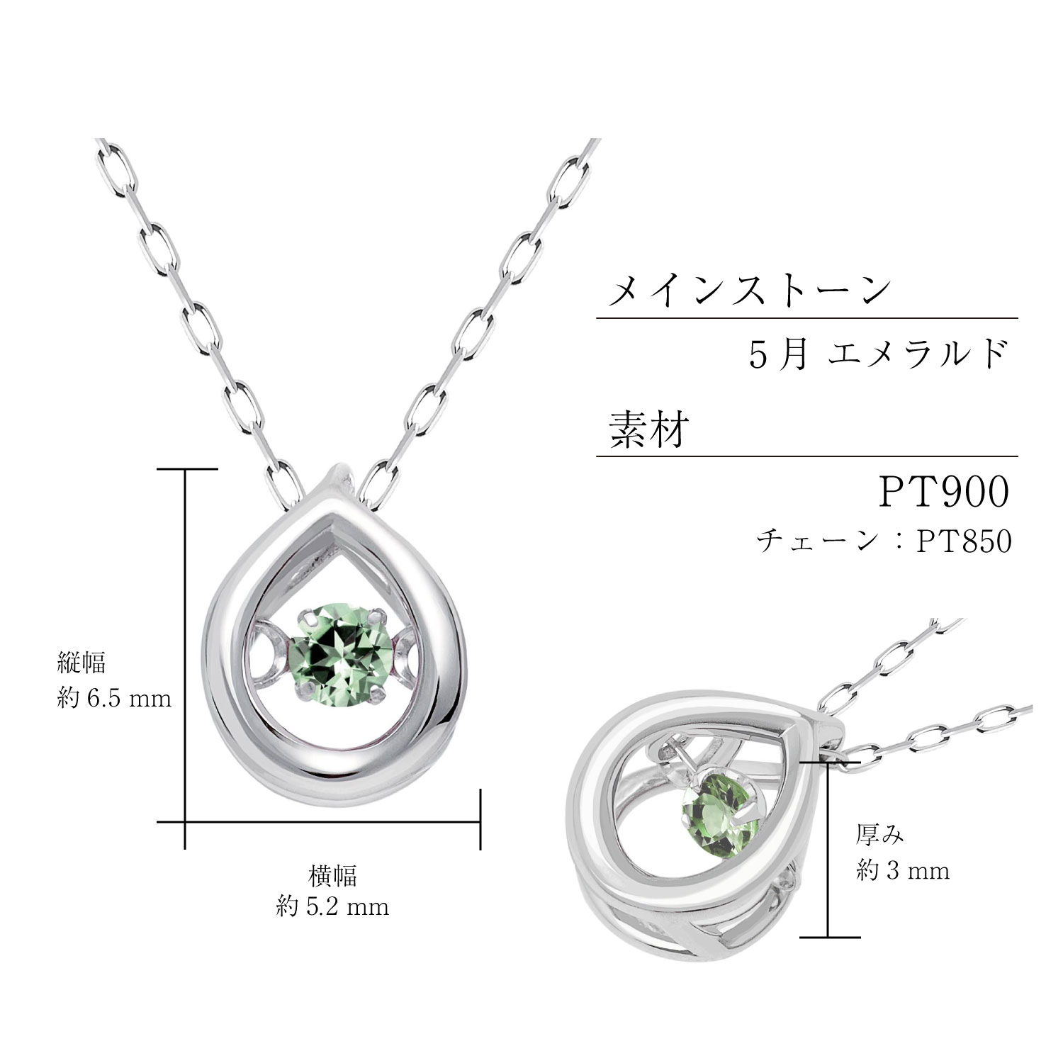 シンプルなドロップデザインネックレスに、選べる12誕生石をあしらった遊び心のあるデザインネックレス。 誕生石は身に着けるとお守りになるとも信じられています。 ファッションアイテムとして、お守りジュエリーとして、そして相手のためだけに選ぶギフトとしてもオススメです。 胸元で振動するように揺れて動く、ダンシングストーン。 石だけが躍る(Dance)ように振動することが特徴。左右の丸カンで結ばれて、前後に細かく揺れて輝きます。 クロスフォー社が開発したこの特殊な技術は数々のメディアで取り上げられ、日本特許を取得し国際特許も申請中。 ダンシングストーンだけの魅力で、世界中の女性のハートを虜にします。 素材:PT900/チェーンPt850 チェーン:あずき 約40cm(Pt850 ) サイズ:約 縦6.5x横5.2mm 石:ダンシングストーン 12誕生石 約0.02ct/エメラルド 付属:ブランド純正ボックス/紙袋/品質証明書 製造国 日本(Made in Japan)