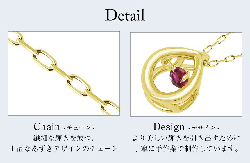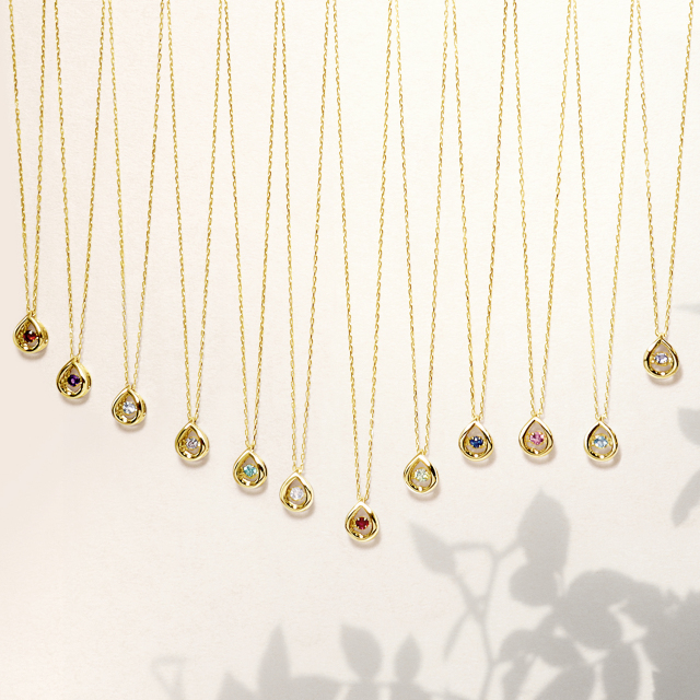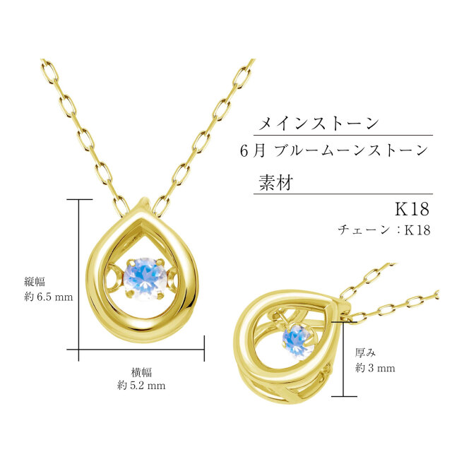 シンプルなドロップデザインネックレスに、選べる12誕生石をあしらった遊び心のあるデザインネックレス。 誕生石は身に着けるとお守りになるとも信じられています。 ファッションアイテムとして、お守りジュエリーとして、そして相手のためだけに選ぶギフトとしてもオススメです。 胸元で振動するように揺れて動く、ダンシングストーン。 石だけが躍る(Dance)ように振動することが特徴。左右の丸カンで結ばれて、前後に細かく揺れて輝きます。 クロスフォー社が開発したこの特殊な技術は数々のメディアで取り上げられ、日本特許を取得し国際特許も申請中。 ダンシングストーンだけの魅力で、世界中の女性のハートを虜にします。 素材:K18YG/チェーンK18YG チェーン:あずき 約40cm(K18YG) サイズ:約 縦6.5x横5.2mm 石:ダンシングストーン 12誕生石 約0.02ct/ムーンストーン 付属:ブランド純正ボックス/紙袋/品質証明書 製造国 日本(Made in Japan)