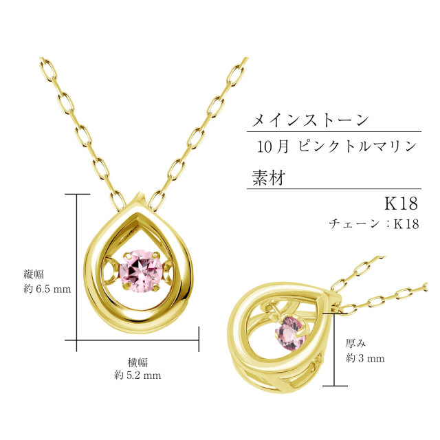 シンプルなドロップデザインネックレスに、選べる12誕生石をあしらった遊び心のあるデザインネックレス。 誕生石は身に着けるとお守りになるとも信じられています。 ファッションアイテムとして、お守りジュエリーとして、そして相手のためだけに選ぶギフトとしてもオススメです。 胸元で振動するように揺れて動く、ダンシングストーン。 石だけが躍る(Dance)ように振動することが特徴。左右の丸カンで結ばれて、前後に細かく揺れて輝きます。 クロスフォー社が開発したこの特殊な技術は数々のメディアで取り上げられ、日本特許を取得し国際特許も申請中。 ダンシングストーンだけの魅力で、世界中の女性のハートを虜にします。 素材:K18YG/チェーンK18YG チェーン:あずき 約40cm(K18YG) サイズ:約 縦6.5x横5.2mm 石:ダンシングストーン 12誕生石 約0.02ct/ピンクトルマリン 付属:ブランド純正ボックス/紙袋/品質証明書 製造国 日本(Made in Japan)