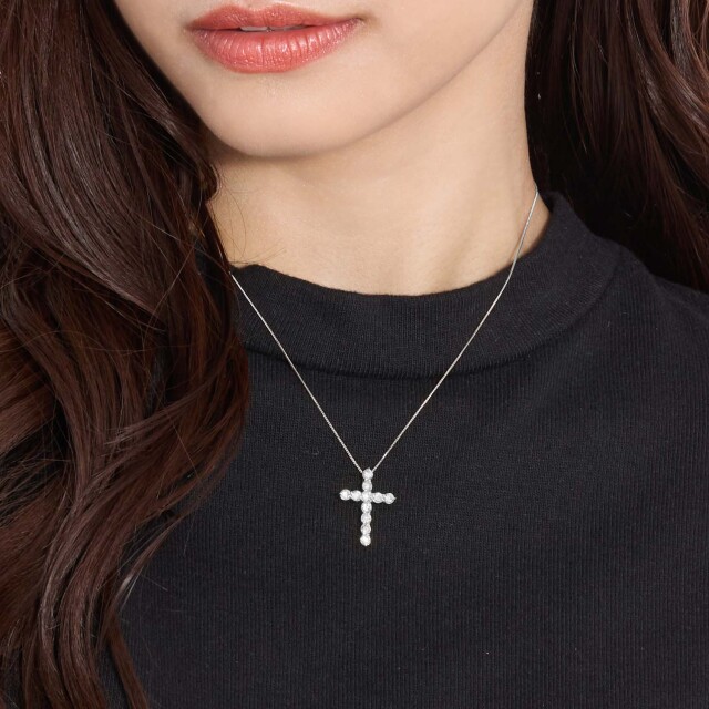 胸元で存在感を放つクロスに、計1.0 ctのダイヤモンドを贅沢にあしらったネックレス。フォーマルからカジュアルまで、アクセントとしてお楽しみいただけます。