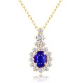 0.2ctのサファイアを、贅沢に天然ダイヤモンド16石で囲ったデザイン。デコルテにしっかりと光を集めて輝きを放ちます。