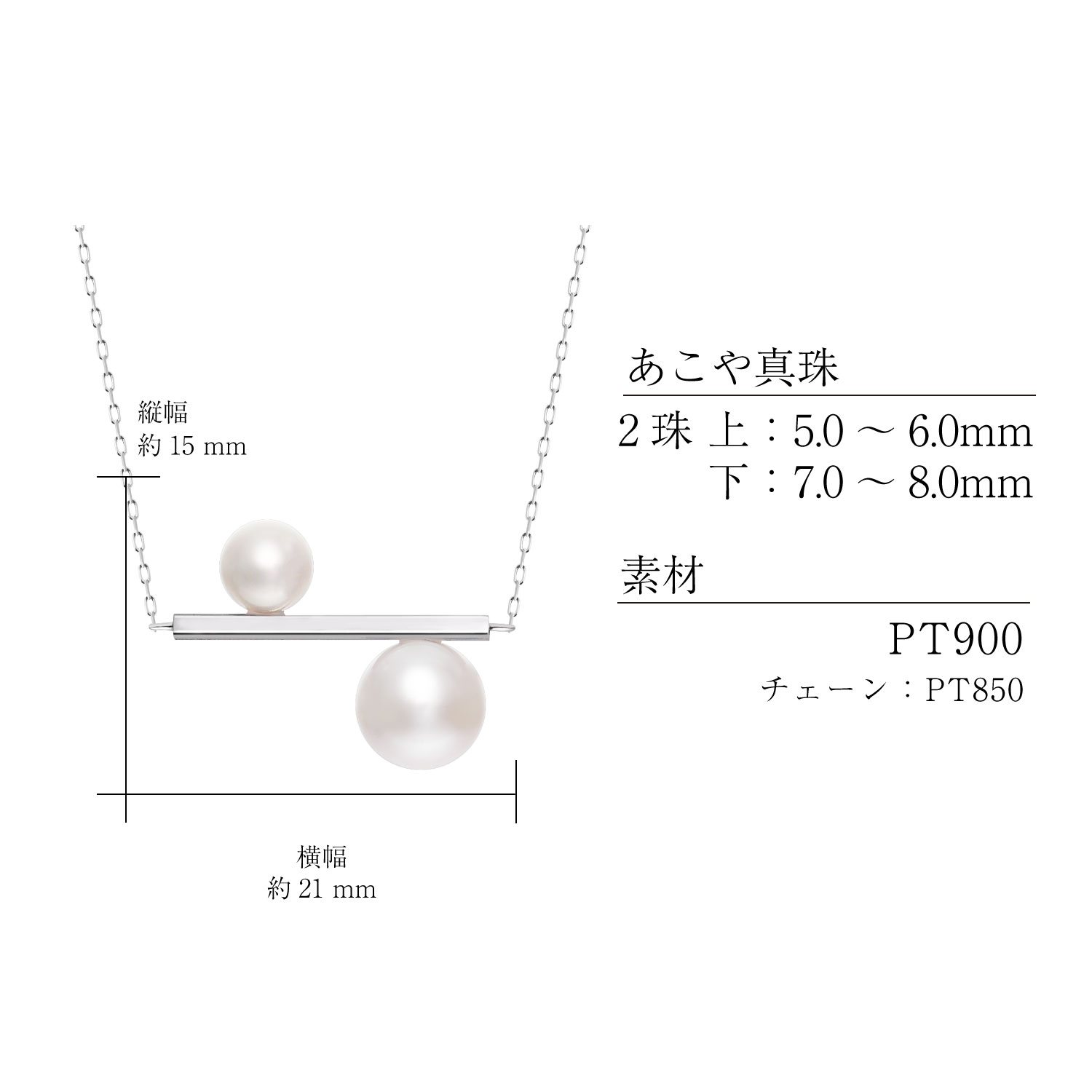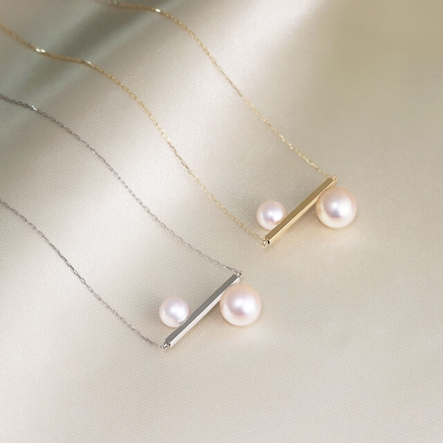 こちらは、洗練されたバーラインに大小2粒のあこや真珠を組み合わせた、PT900(プラチナ)ネックレスです。