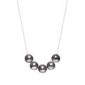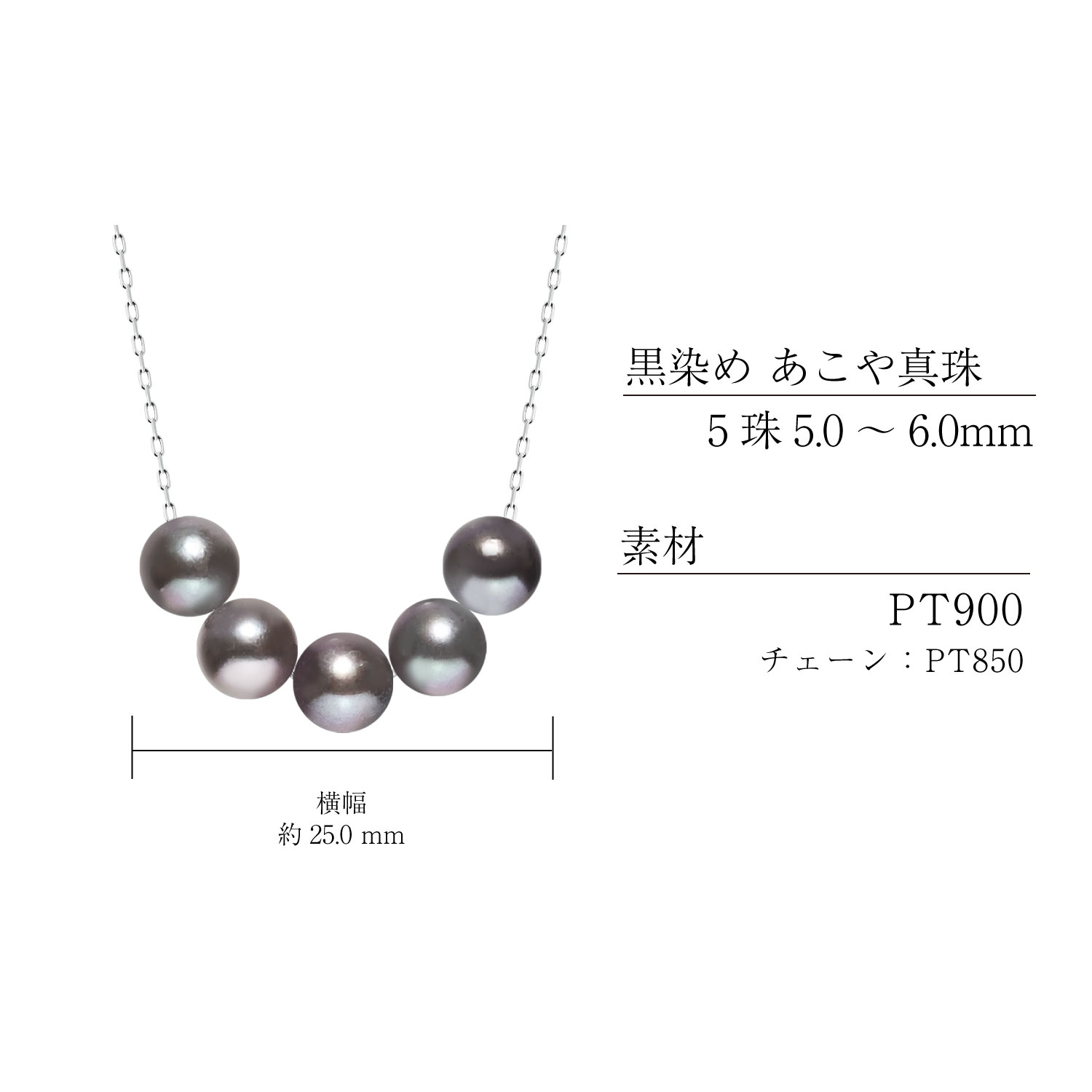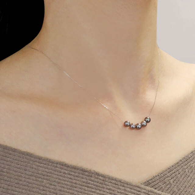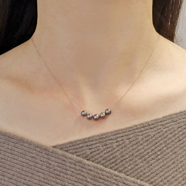 染め黒あこや真珠を5珠並べたPT900(プラチナ)スルーネックレスは、ラインを描き、大人の装いにモダンなアクセントを添えます。