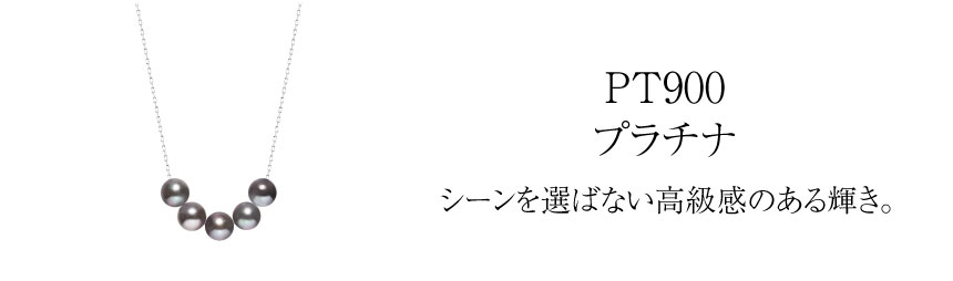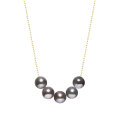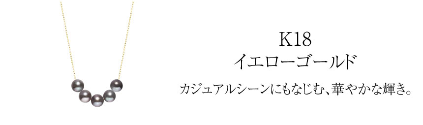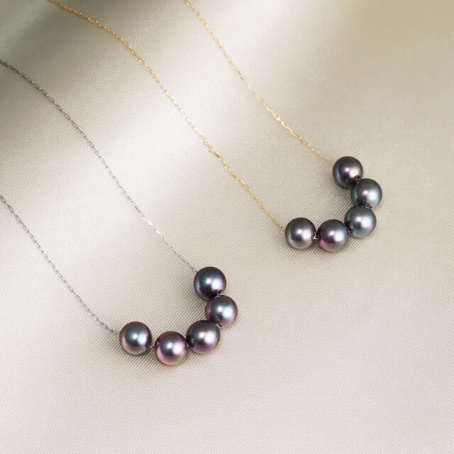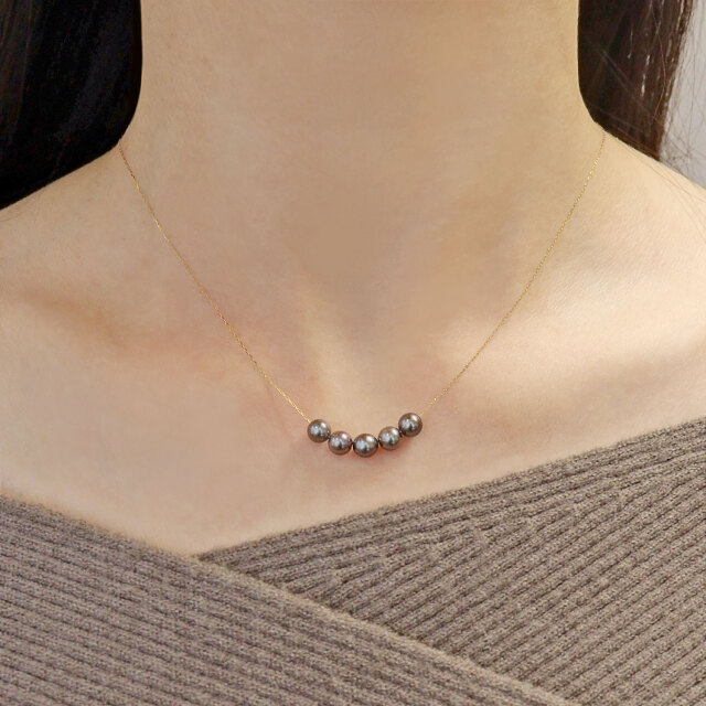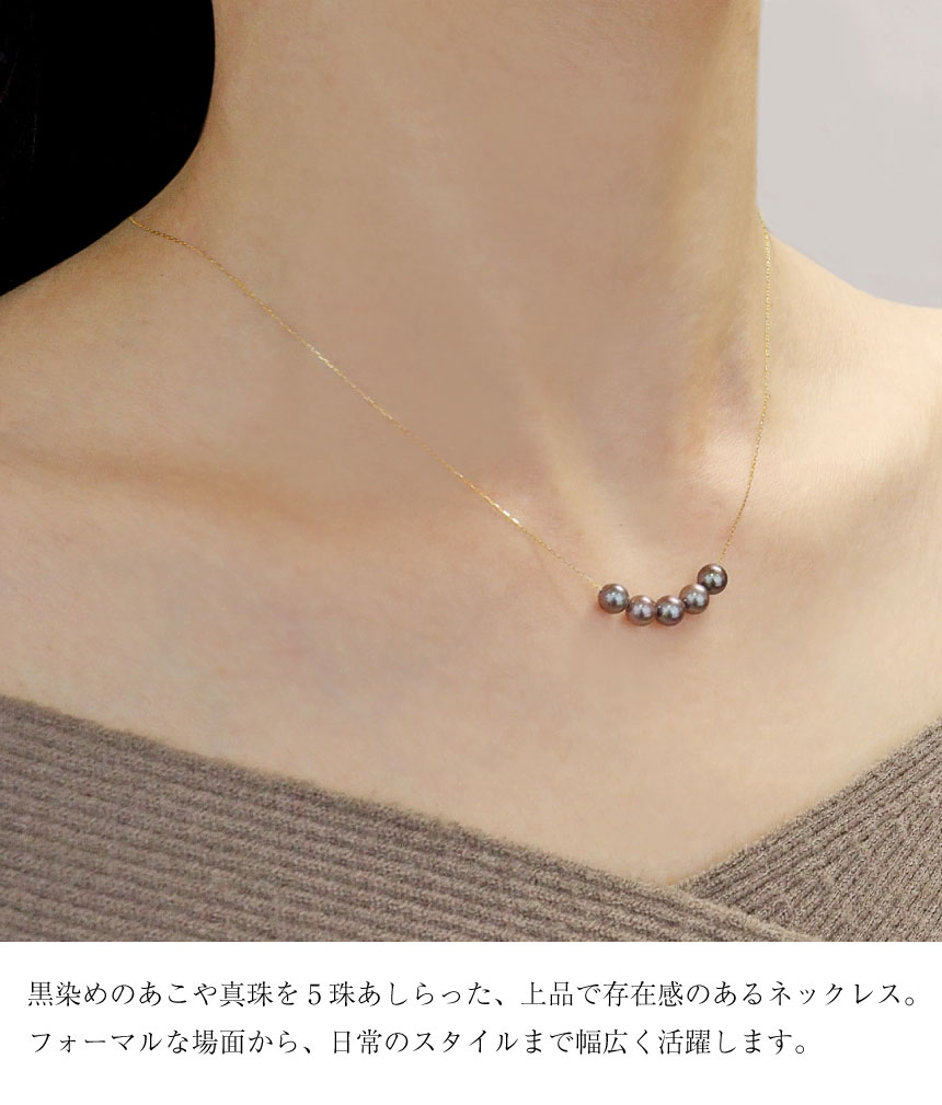 染め黒あこや真珠を5珠並べた18金(K18)スルーネックレスは、ラインを描き、大人の装いにモダンなアクセントを添えます。
