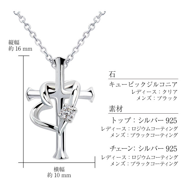 王道人気モチーフのクロスとハートが絶妙なバランスで溶け合った、ペアネックレス。シンプルなクロスにシェイプされたハートが絶妙なバランスでセッティングされたネックレス。ハートにはキュービックジルコニアがセットされ、高級感を醸し出してくれます。クロスとハートは取り外しが出来るので、気分に合わせて、クロスだけで楽しむのもOK、ハートだけでもOK!更に相手のクロスとあわせてBKクロス×SVクロスの組み合わせや、BKハート×BKハートの組み合わせも出来ちゃう。様々なコーディネートを楽しめちゃう、とっても欲張りなペアネックレス。専用の紙袋・ケースが無料で付属するので、プレゼント・ギフトにとってもオススメ。