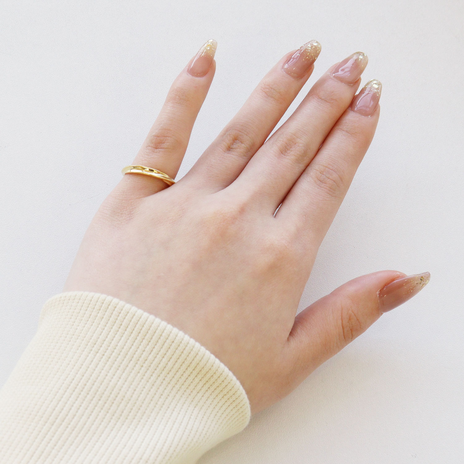 緩やかなカーブを描く、さりげないデザインのシンプルなリングは、