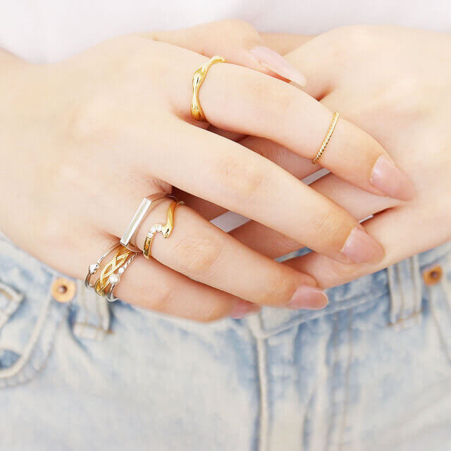 一つの指に絞る必要はありません。異なる意味を持つ指にリングを重ねる「マルチレイヤード」がトレンドです。