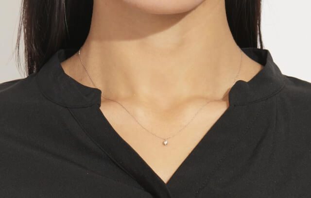 ダイヤモンドやキュービックジルコニア(CZ)のシンプルな一粒デザインは、どんな洋服の素材や色、柄にも干渉しません。それどころか、鎖骨の中央で上品に輝き、着る人の肌や表情を明るく見せる効果があります。これが、オフィスからカジュアル、フォーマルまで、あらゆるシーンで活躍できる最大の理由です。