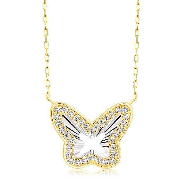 白のオーバーサイズシャツの襟を少し抜き、長さを調整したバタフライモチーフのネックレスを。蝶がデコルテにふわりと止まっているような演出は、友人同士の集まりでも注目の的に。遊び心のあるモチーフは、春の会話をより弾ませてくれます。