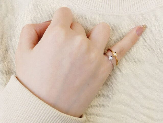 春の定番といえばフラワーモチーフです。蕾が開き、花が咲く様子は「美しさ」や「幸せ」の象徴。2026年のトレンドは、写実的すぎないミニマルで抽象的なフラワーデザインです。一粒の小さなダイヤモンドを中心に据えた花びらのデザインは、大人の女性の可愛らしさと気品を同時に引き出します。