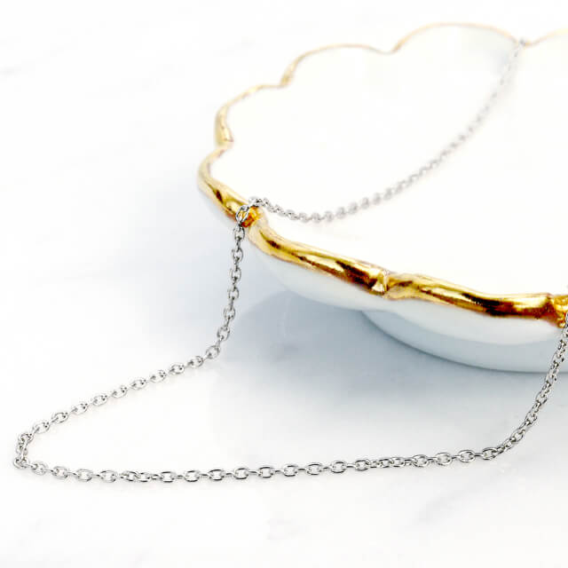 「アズキチェーン(小豆チェーン)」は、丸い輪を連結させた最もポピュラーな形状です。その名の通り小豆のような丸みがあり、カジュアルからフォーマルまで幅広く対応します。