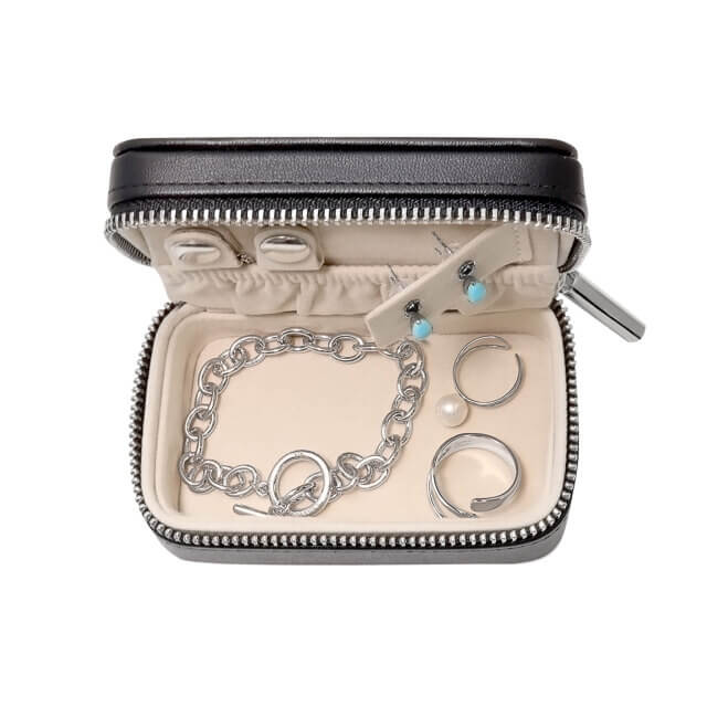 • ジッパー(ファスナー)仕様: 信頼性の高いジッパー式を採用しているため、移動中の衝撃で蓋が開いてジュエリーが飛び出す心配がありません。